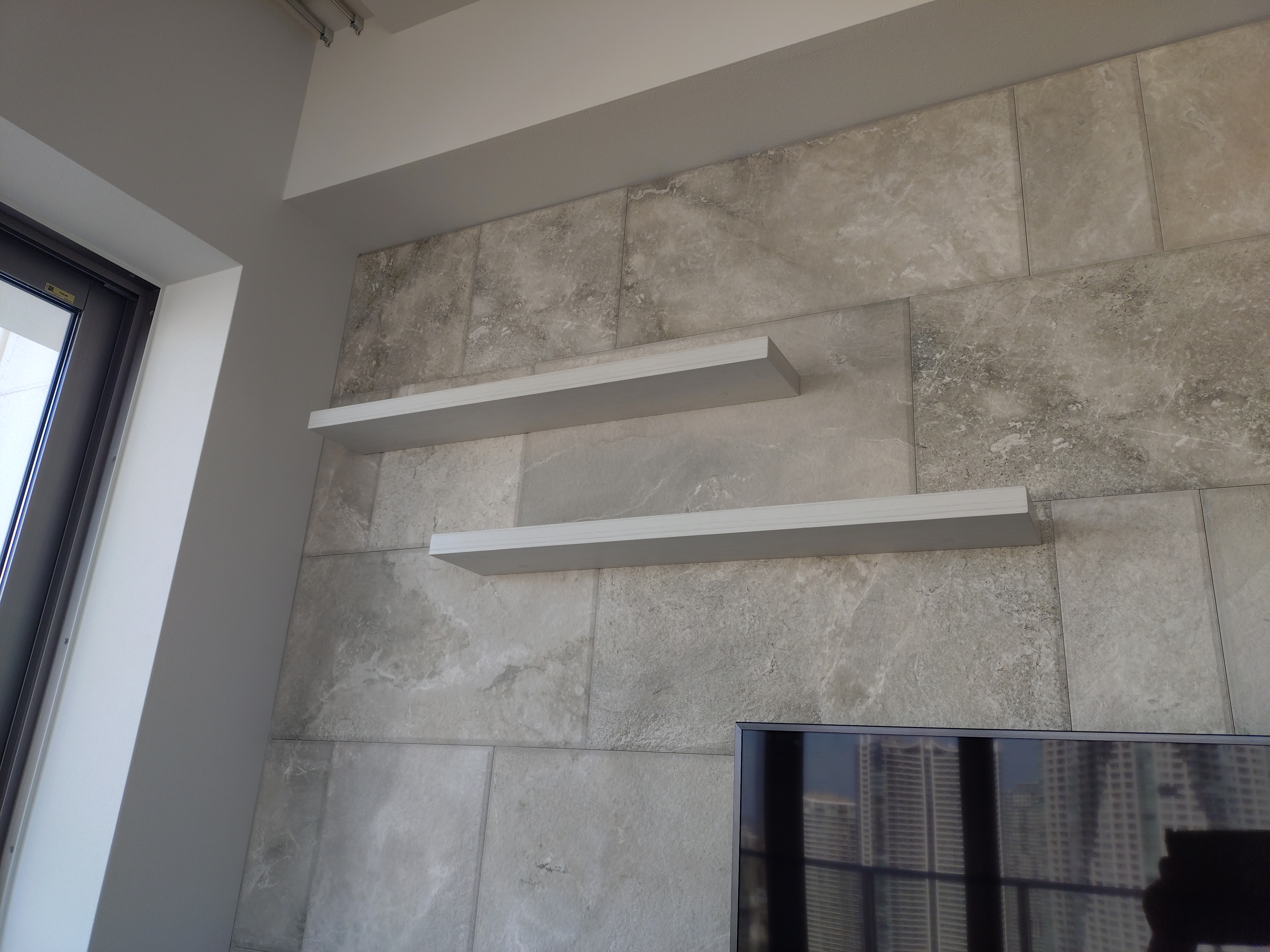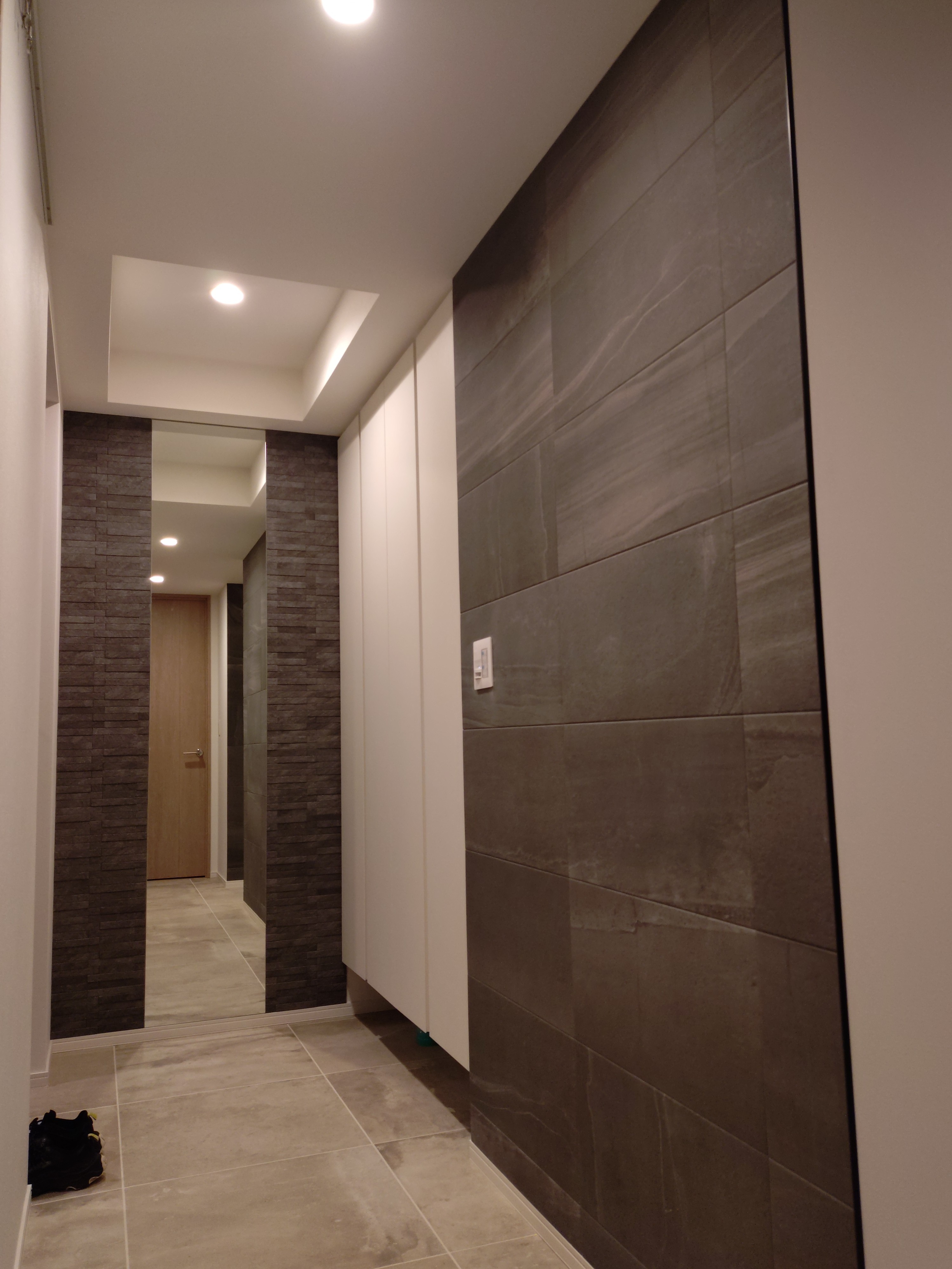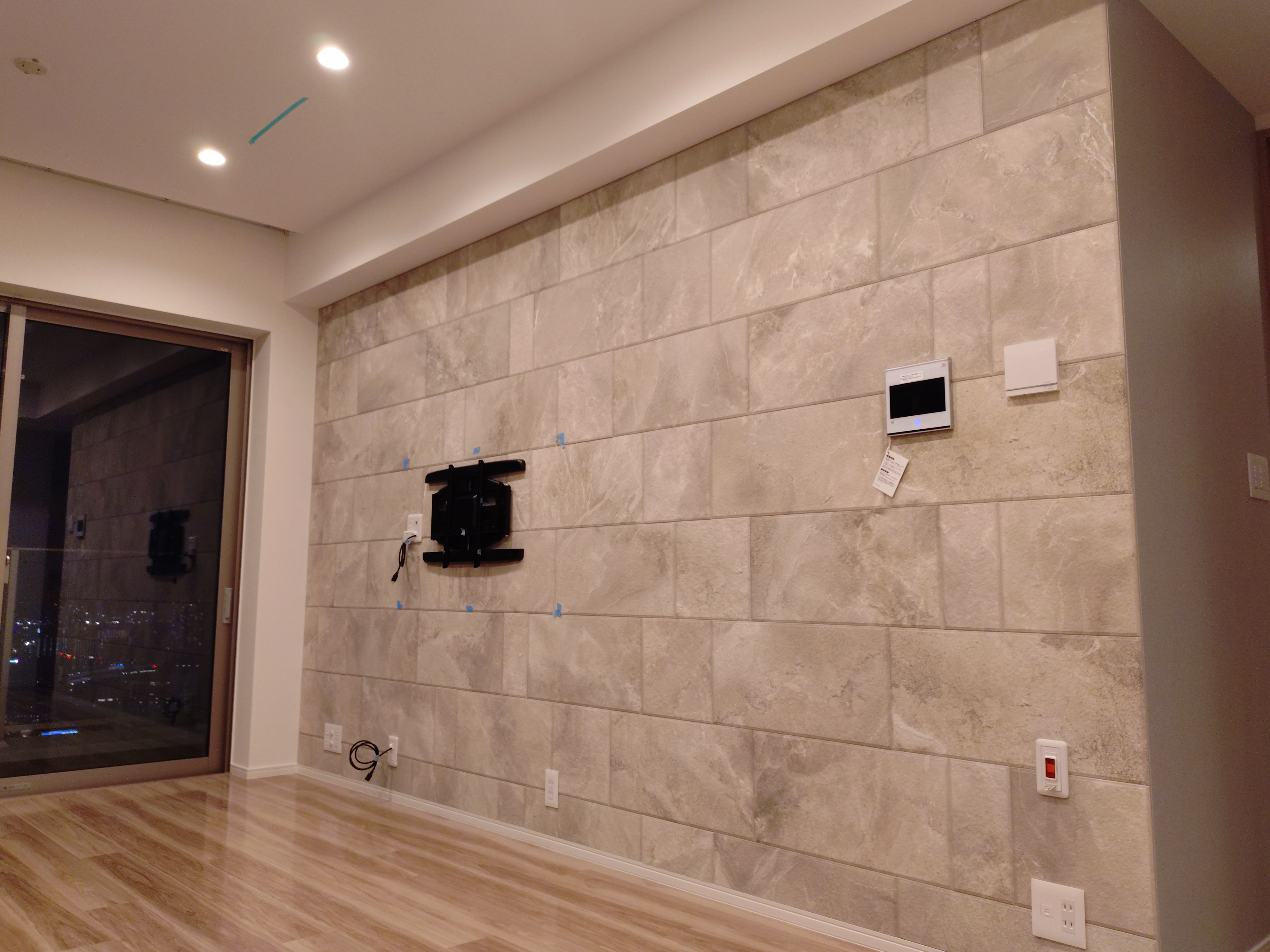 晴海フラッグにてエコカラット多面施工やテレビ壁掛け工事などの依頼を受けました。エコカラットはリビングにサンティエとテレビ壁掛け工事、エコカラット壁にはリクシルのヴィータスを二枚取り付けしました。寝室はエコカラット・ファブリコ、廊下にはストーングレス・ダークグレー、玄関にはオーダーミラー✕ルドラを施工致しました。その他寝室にもテレビ壁掛け工事をしました。