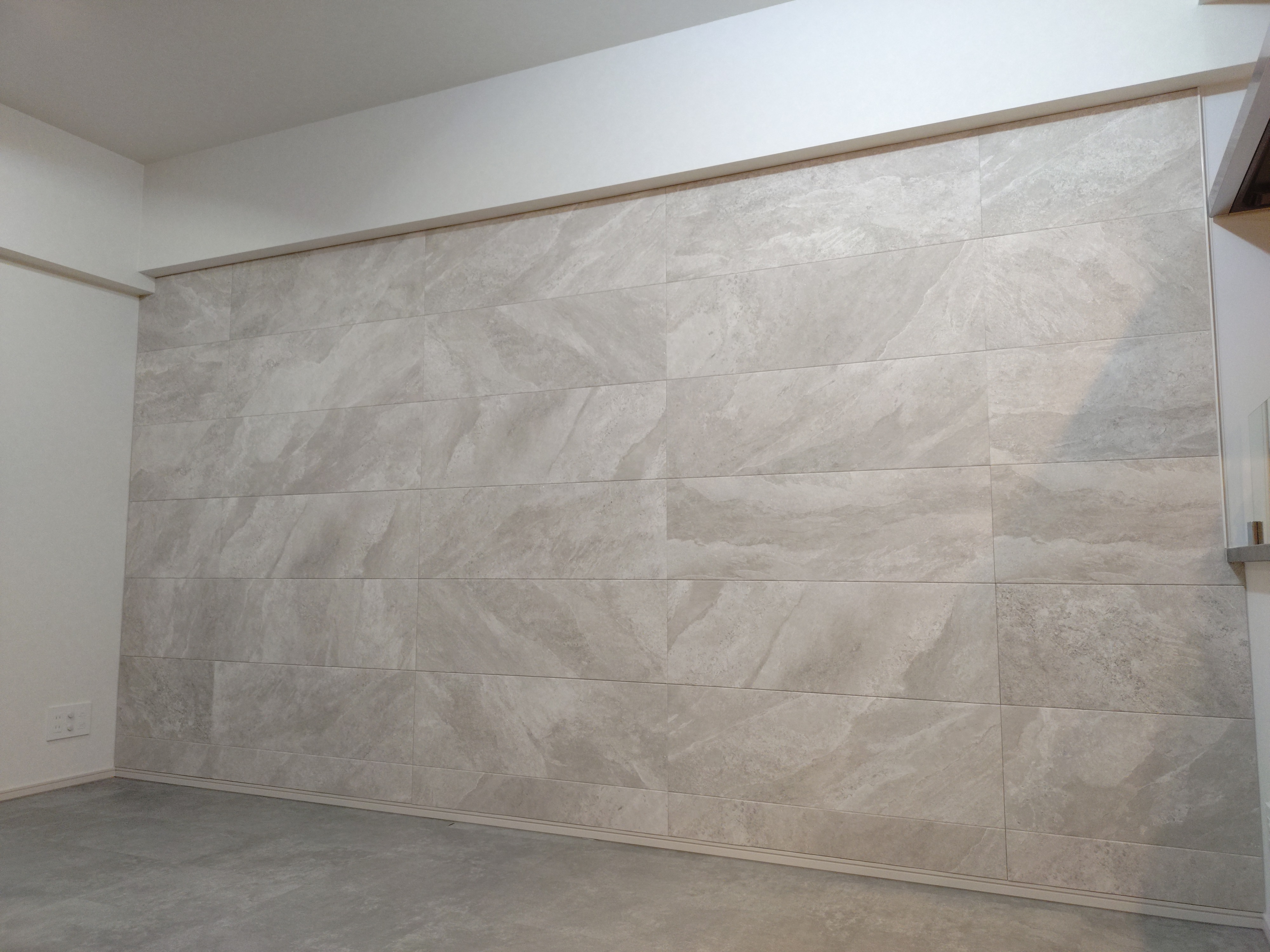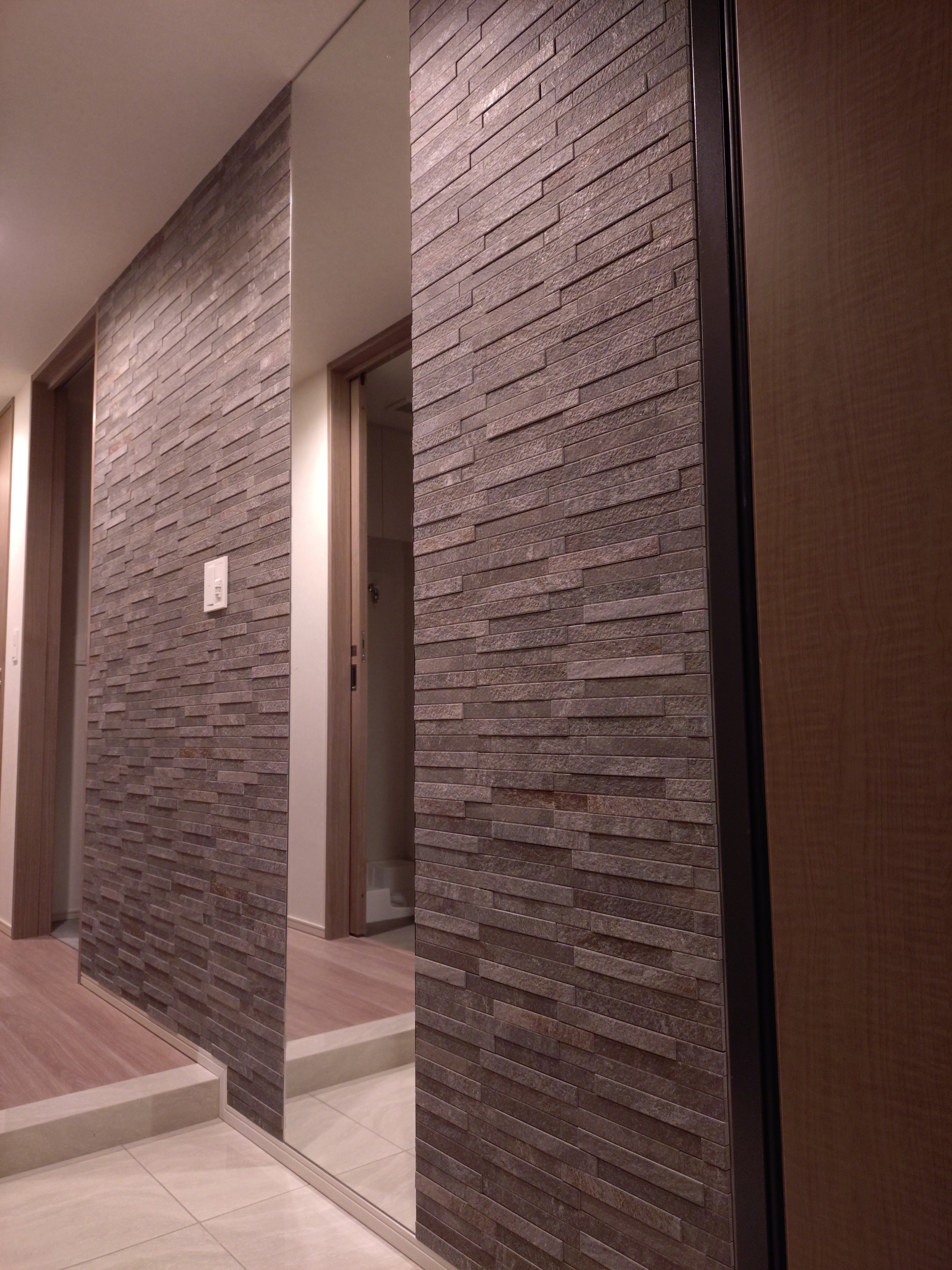 練馬区でエコカラット施工 練馬区の新築マンション、バウス氷川台にてインテリアオプション施工を行いました。リビングにはハイグレードのエコカラット・マジェスティックスレートをイモ貼りで施工しました。玄関にはオーダーミラーとのコラボ施工でディニタ・ダークグレーを施工しました。その他洋室にはピクチャ―レール2000mmを施工しました。 エコカラット2面施工+ピクチャーレール2000mm+玄関オーダーミラー 合計金額354,200円