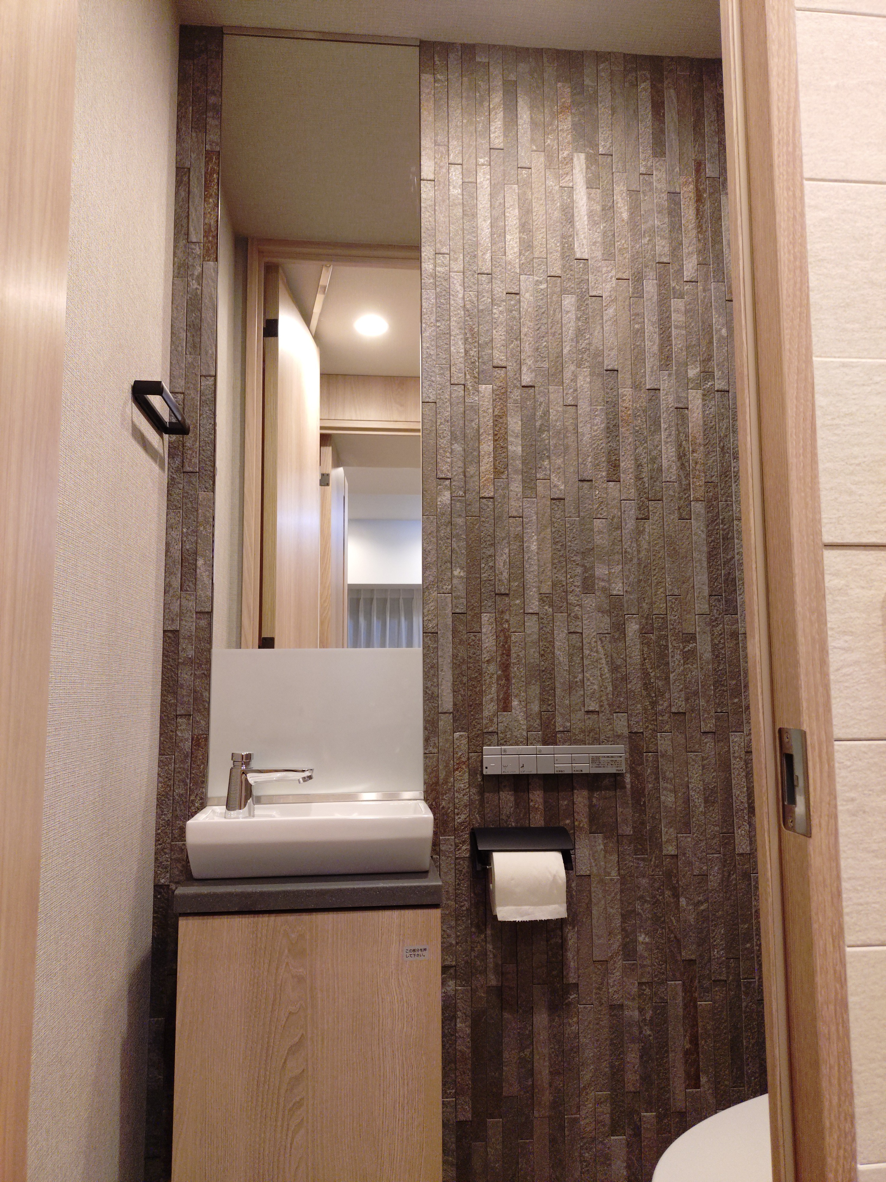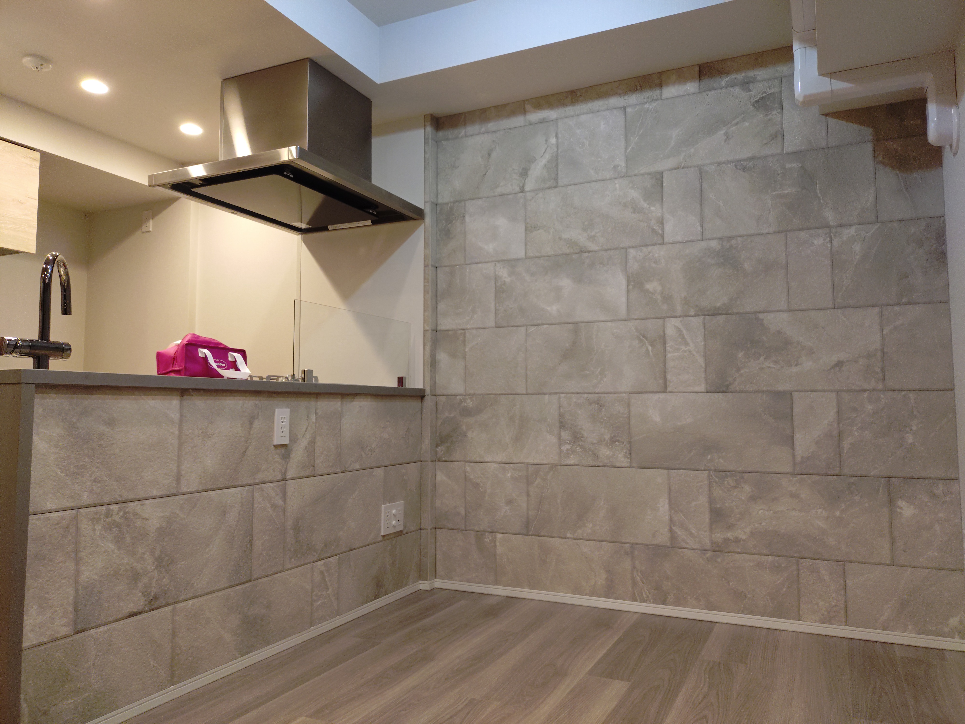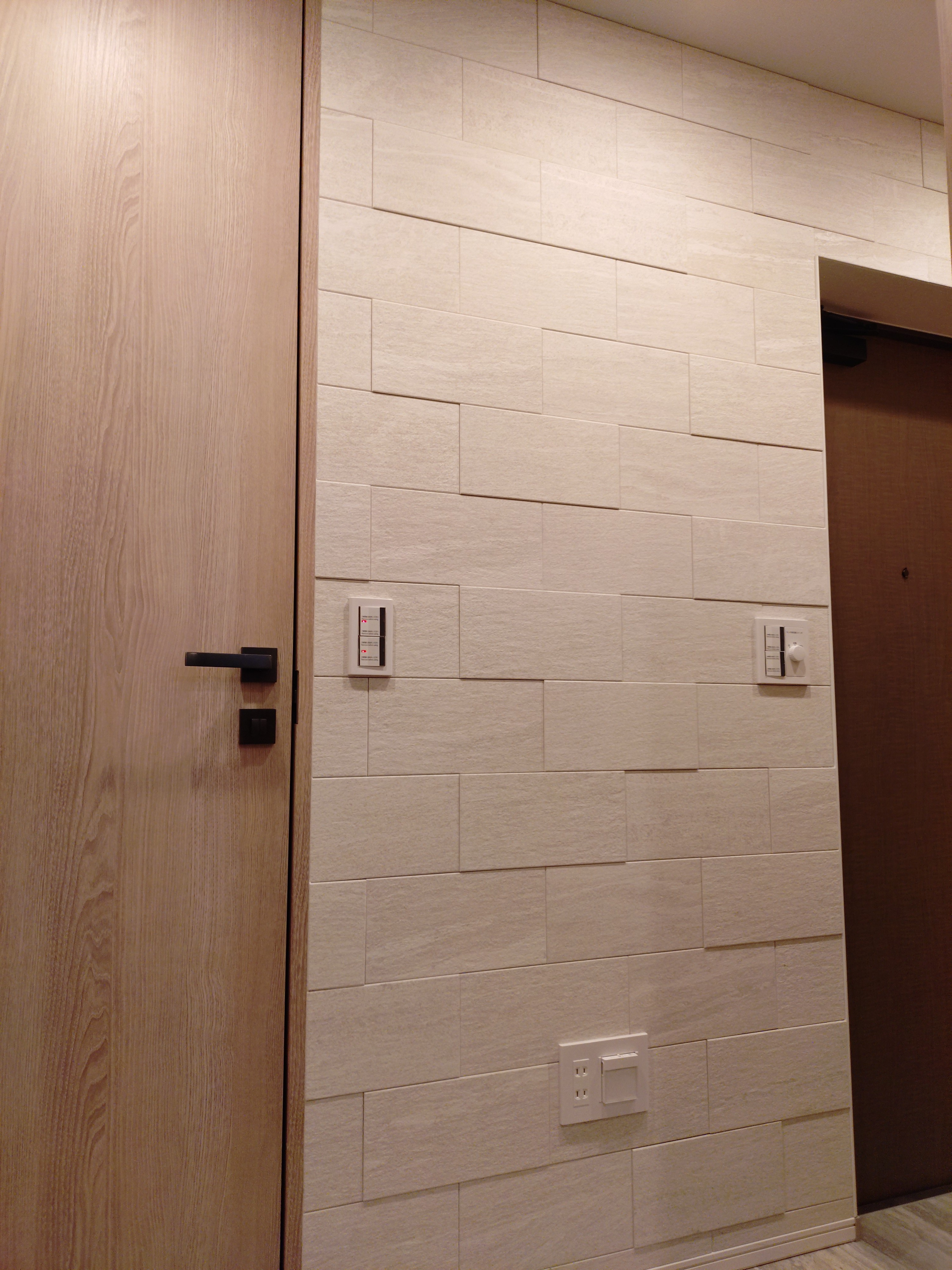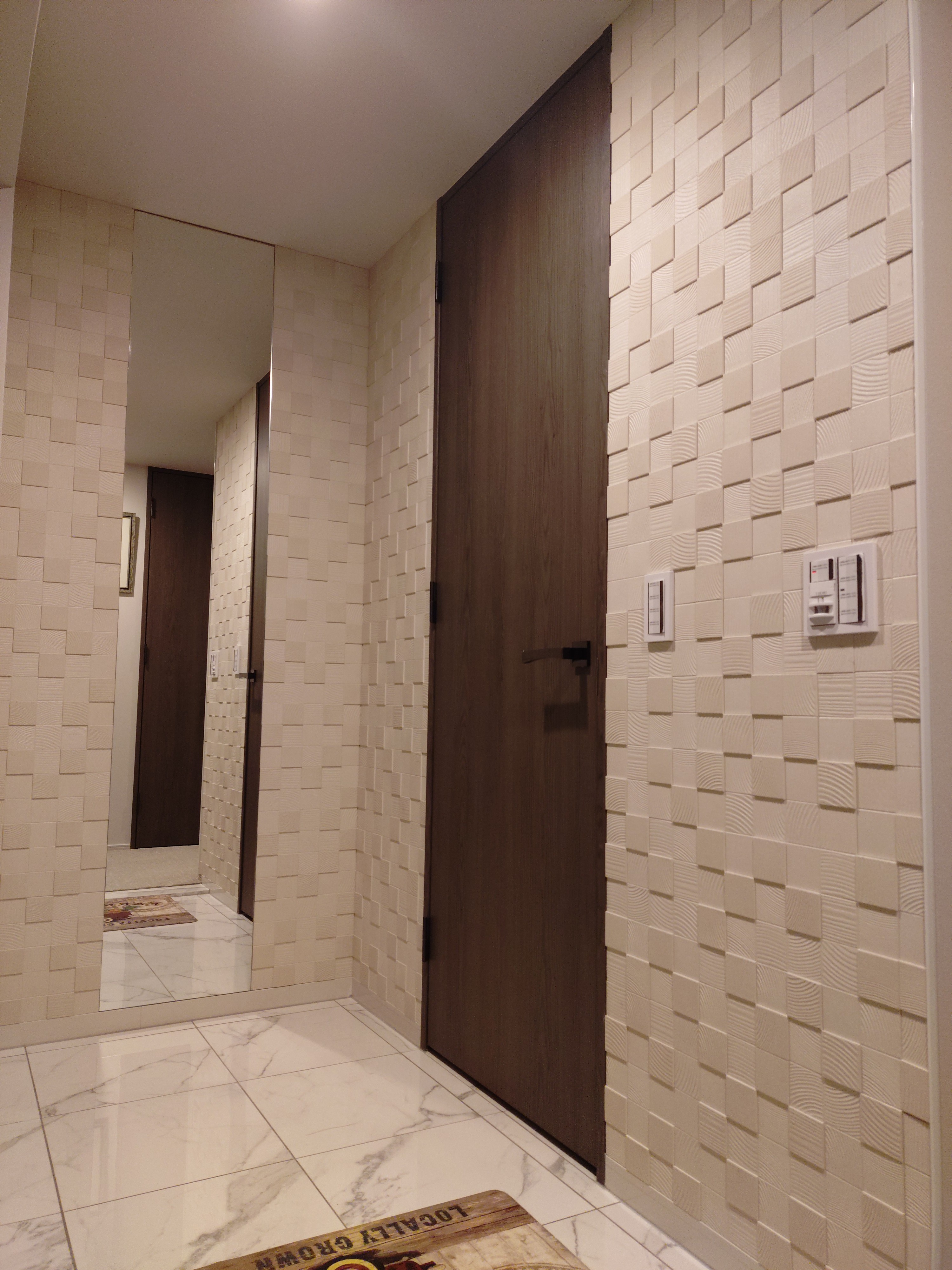 リビング・キッチン壁にはサンティエ・アイボリー、寝室にはグランクオーツのアイボリー、玄関廊下はヴァルスロック・ホワイト、トイレはディニタを施工しました。他に玄関にオーダーミラー、ピクチャ―レールなどのインテリアオプション施工をさせて頂きました。