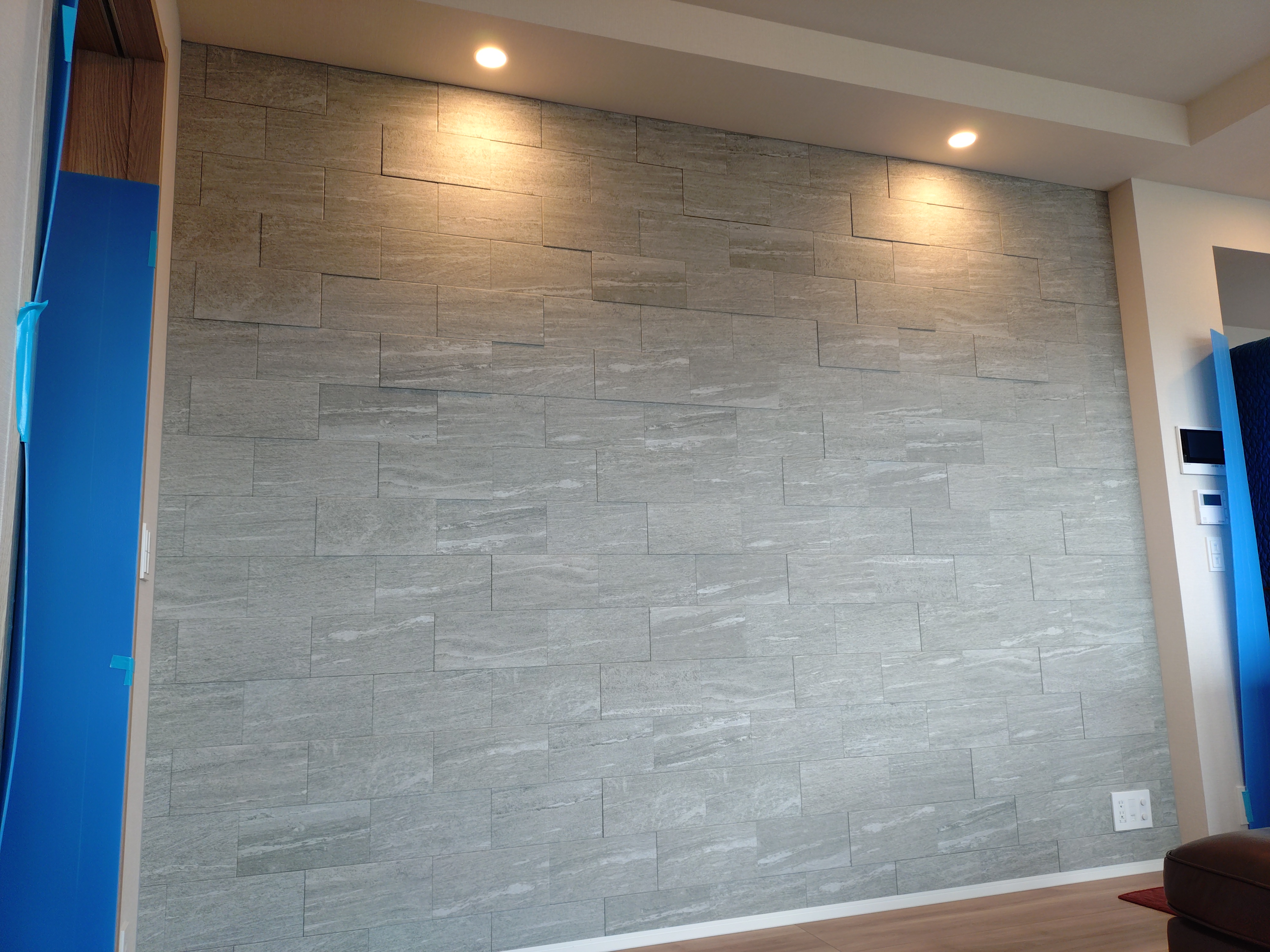 千種区のグランドメゾン池下ザ・ガーデンタワーにてエコカラット施工を行いました。陽の当たるリビングの壁にヴァルスロックのグレーを施工しました。