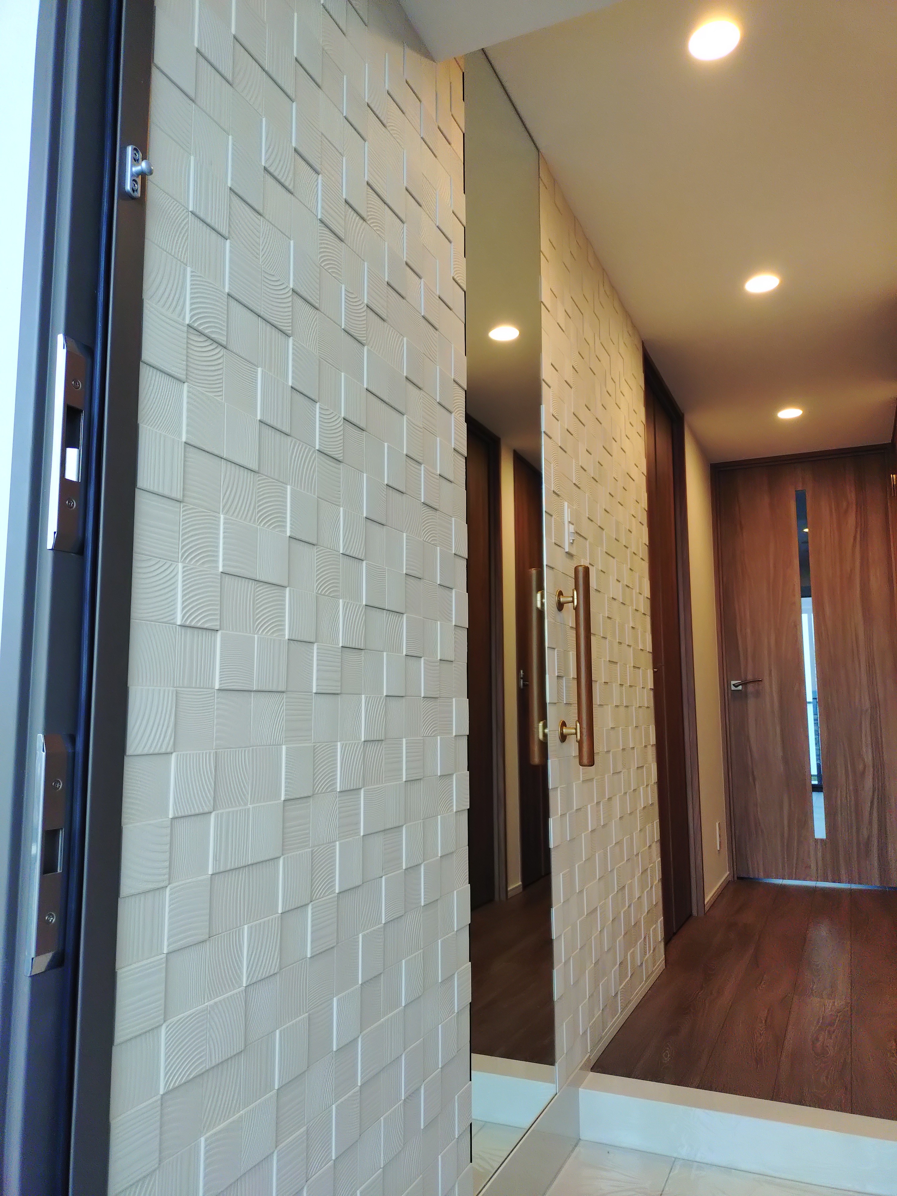 港区でエコカラット☓テレビ壁掛け工事 港区の高層タワーマンション、ワールドシティタワーズにてエコカラットとテレビ壁掛け工事を施工しました。リビングのエコカラットはストーングレースにフリーアームのテレビ壁掛け工事をして玄関にもエコカラット・ストーングレースを施工しました。 エコカラット2面施工 216,700円 テレビ壁掛け工事(隠避配線・コンセント増設・アンテナ移設など) 64,350円