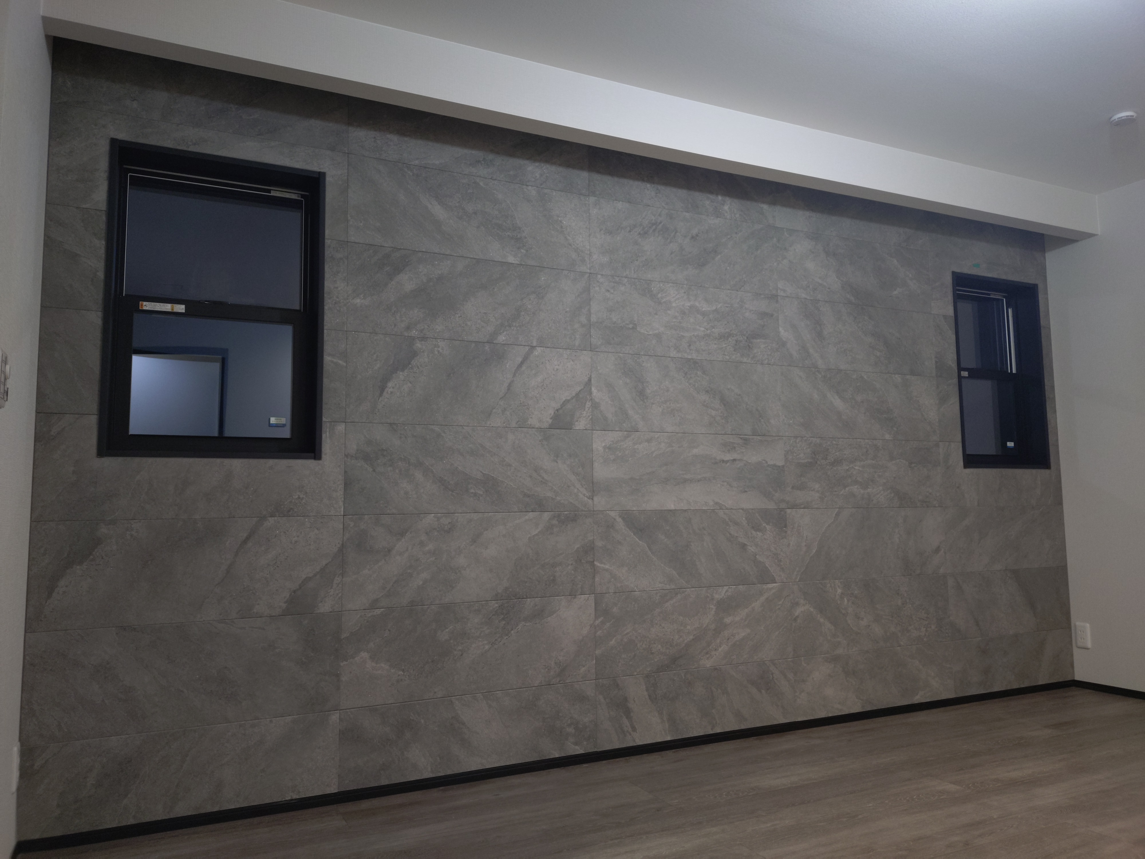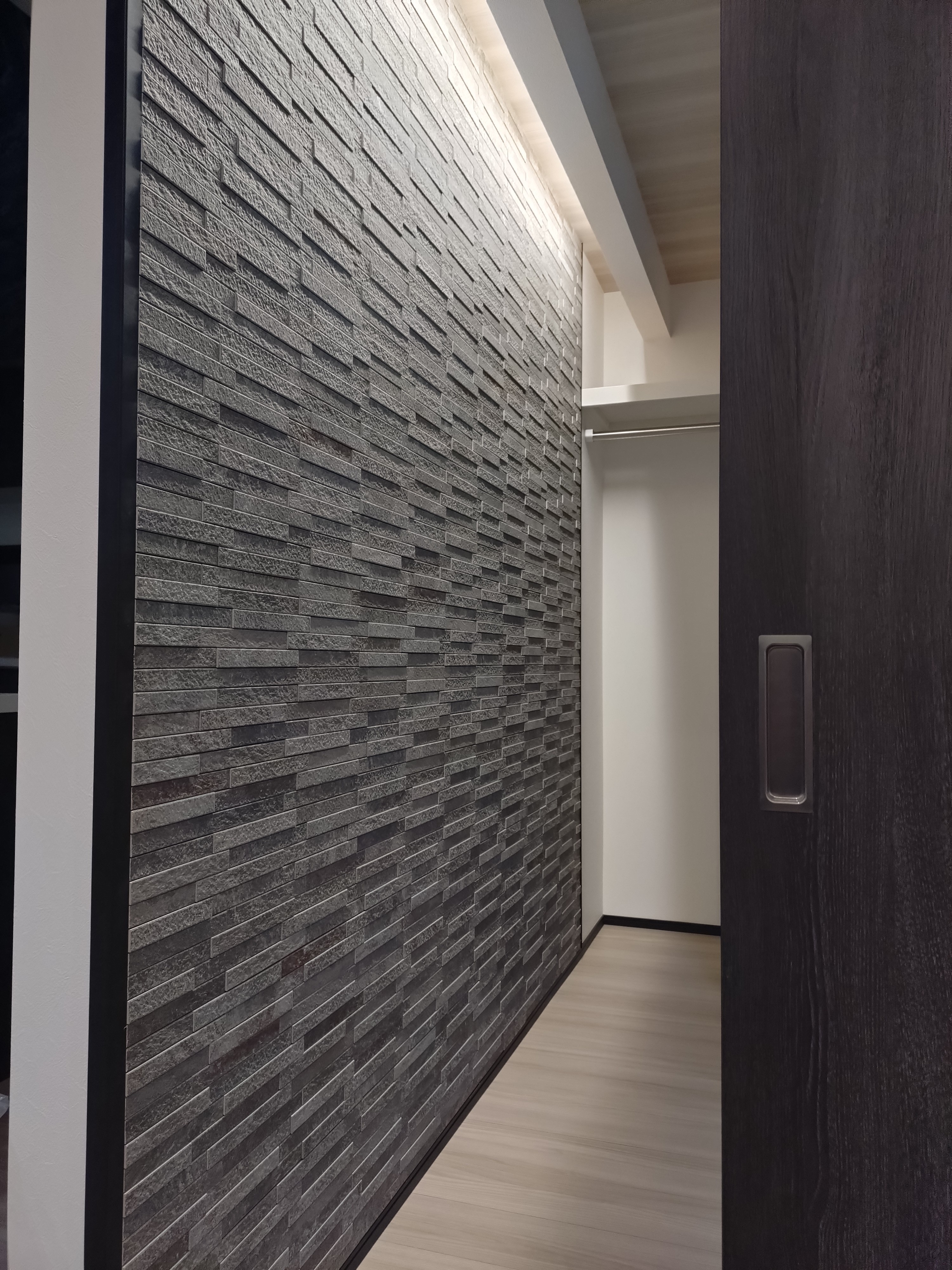 練馬区でエコカラット施工 練馬区の新築マンション、バウス氷川台にてインテリアオプション施工を行いました。リビングにはハイグレードのエコカラット・マジェスティックスレートをイモ貼りで施工しました。玄関にはオーダーミラーとのコラボ施工でディニタ・ダークグレーを施工しました。その他洋室にはピクチャ―レール2000mmを施工しました。 エコカラット2面施工+ピクチャーレール2000mm+玄関オーダーミラー 合計金額354,200円